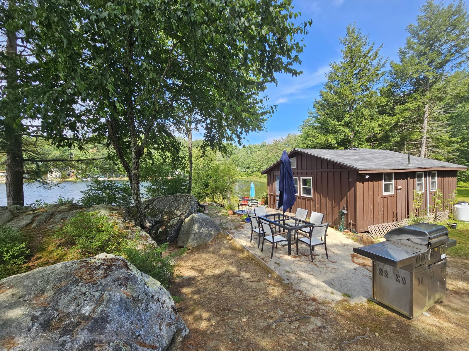Location next to the cove gives a front row view of the peaceful water, with a private outdoor dining table and grill.